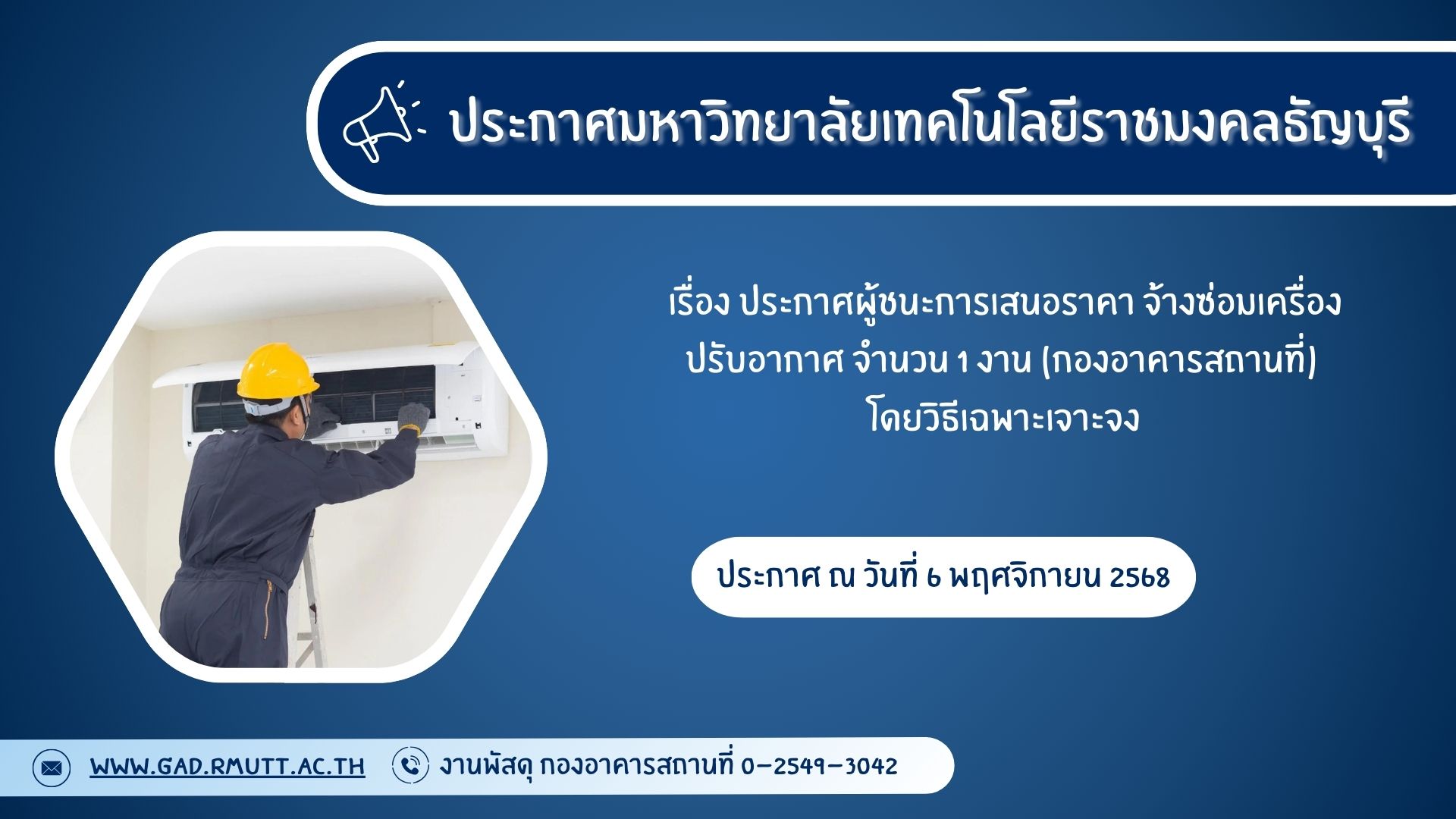 พฤศจิกายน 6, 2025Published by jaruwan pinkaew at พฤศจิกายน 6, 2025ประกาศผู้ชนะการเสนอราคา จ้างซ่อมเครื่องปรับอากาศ จำนวน 1 งาน (กองอาคารสถานที่) โดยวิธีเฉพาะเจาะจงประกาศมหาวิทยาลัยเทคโนโลยี… อ่านเพิ่มเติม ประกาศผู้ชนะการเสนอราคา จ้างซ่อมเครื่องปรับอากาศ จำนวน 1 งาน (กองอาคารสถานที่) โดยวิธีเฉพาะเจาะจง