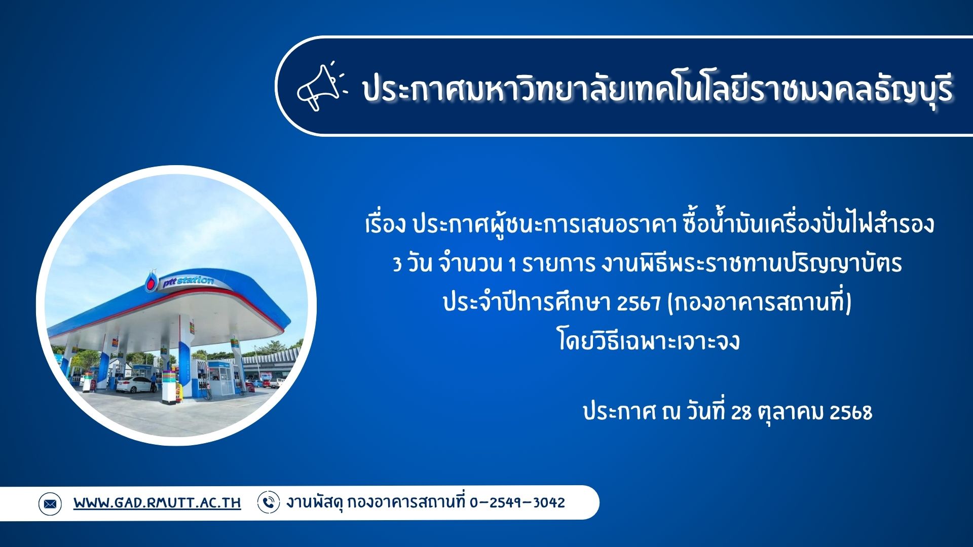ตุลาคม 28, 2025Published by jaruwan pinkaew at ตุลาคม 28, 2025ประกาศผู้ชนะการเสนอราคา ซื้อน้ำมันเครื่องปั่นไฟสำรอง 3 วัน จำนวน 1 รายการ งานพิธีพระราชทานปริญญาบัตร ประจำปีการศึกษา 2567 (กองอาคารสถานที่) โดยวิธีเฉพาะเจาะจงประกาศมหาวิทยาลัยเทคโนโลยี… อ่านเพิ่มเติม ประกาศผู้ชนะการเสนอราคา ซื้อน้ำมันเครื่องปั่นไฟสำรอง 3 วัน จำนวน 1 รายการ งานพิธีพระราชทานปริญญาบัตร ประจำปีการศึกษา 2567 (กองอาคารสถานที่) โดยวิธีเฉพาะเจาะจง