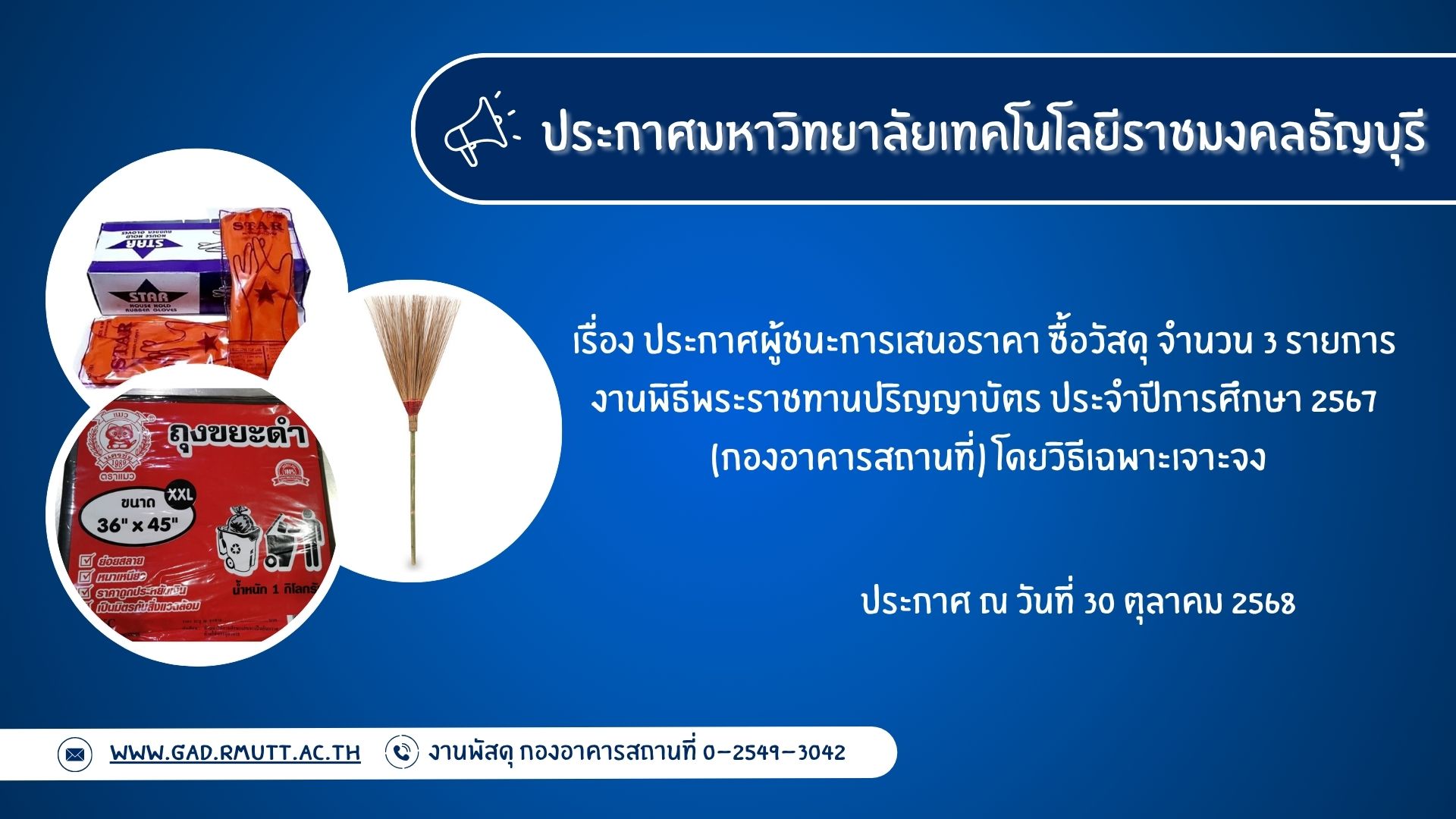 ตุลาคม 30, 2025Published by jaruwan pinkaew at ตุลาคม 30, 2025ประกาศผู้ชนะการเสนอราคา ซื้อวัสดุ จำนวน 3 รายการ งานพิธีพระราชทานปริญญาบัตร ประจำปีการศึกษา 2567 (กองอาคารสถานที่) โดยวิธีเฉพาะเจาะจงประกาศมหาวิทยาลัยเทคโนโลยี… อ่านเพิ่มเติม ประกาศผู้ชนะการเสนอราคา ซื้อวัสดุ จำนวน 3 รายการ งานพิธีพระราชทานปริญญาบัตร ประจำปีการศึกษา 2567 (กองอาคารสถานที่) โดยวิธีเฉพาะเจาะจง