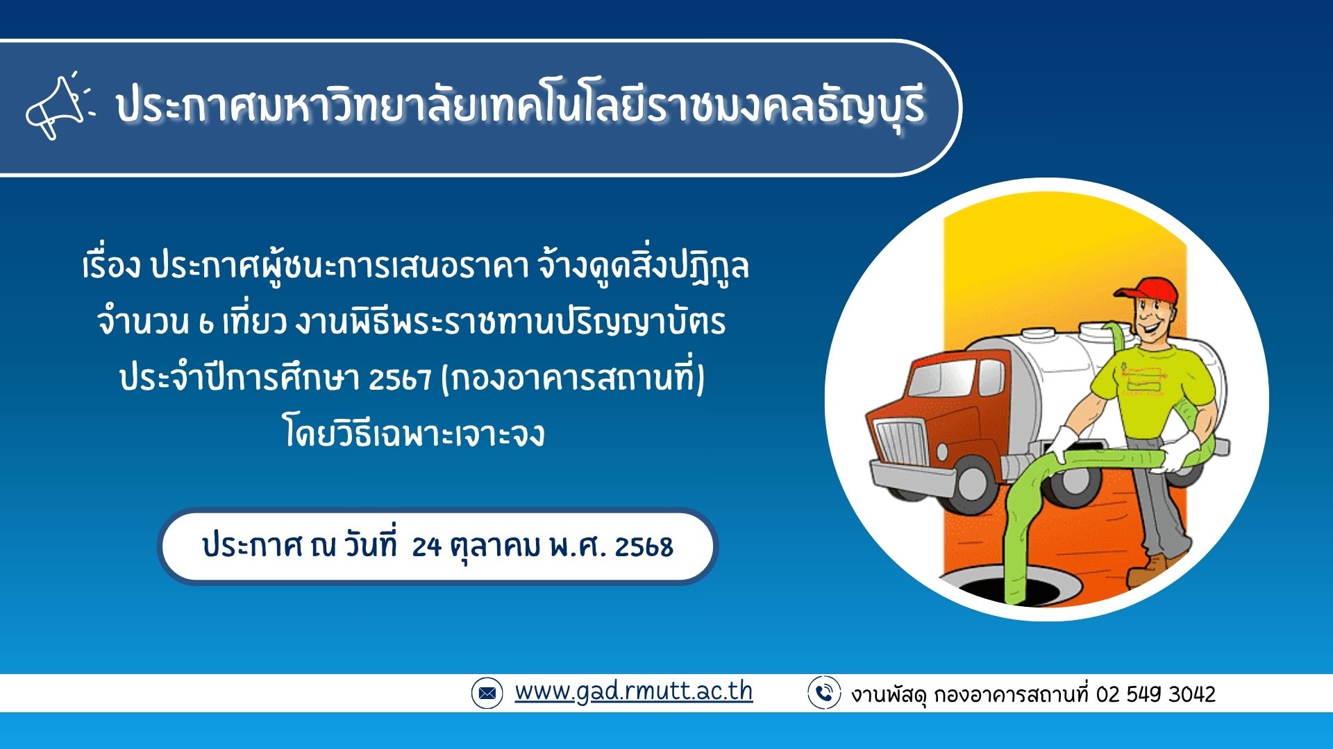 ตุลาคม 24, 2025Published by jaruwan pinkaew at ตุลาคม 24, 2025ประกาศผู้ชนะการเสนอราคา จ้างดูดสิ่งปฏิกูล จำนวน 6 เที่ยว งานพิธีพระราชทานปริญญาบัตร ประจำปีการศึกษา 2567 (กองอาคารสถานที่) โดยวิธีเฉพาะเจาะจงประกาศมหาวิทยาลัยเทคโนโลยี… อ่านเพิ่มเติม ประกาศผู้ชนะการเสนอราคา จ้างดูดสิ่งปฏิกูล จำนวน 6 เที่ยว งานพิธีพระราชทานปริญญาบัตร ประจำปีการศึกษา 2567 (กองอาคารสถานที่) โดยวิธีเฉพาะเจาะจง