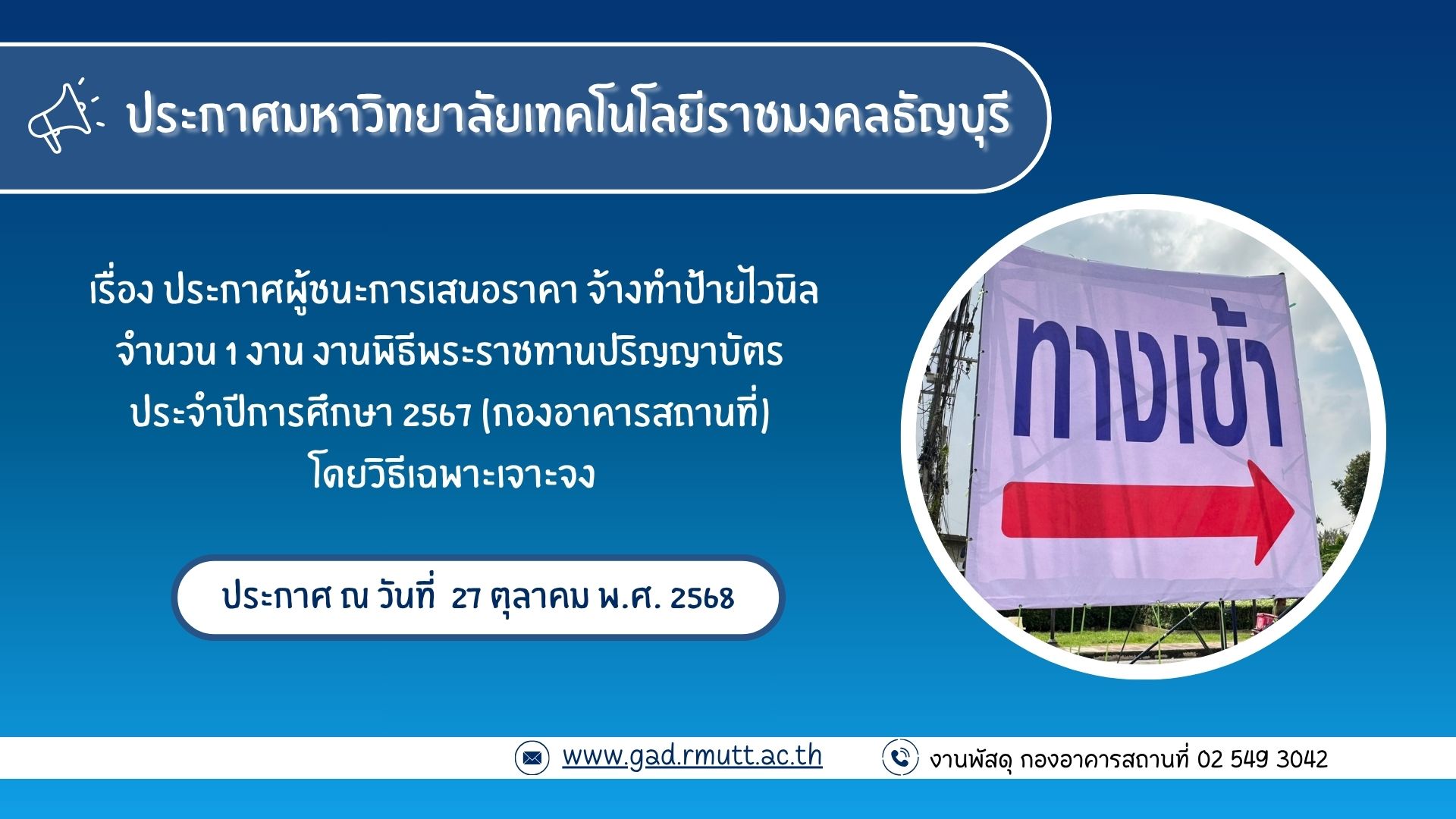 ตุลาคม 27, 2025Published by jaruwan pinkaew at ตุลาคม 27, 2025ประกาศผู้ชนะการเสนอราคา จ้างทำป้ายไวนิล จำนวน 1 งาน งานพิธีพระราชทานปริญญาบัตร ประจำปีการศึกษา 2567 (กองอาคารสถานที่) โดยวิธีเฉพาะเจาะจงประกาศมหาวิทยาลัยเทคโนโลยี… อ่านเพิ่มเติม ประกาศผู้ชนะการเสนอราคา จ้างทำป้ายไวนิล จำนวน 1 งาน งานพิธีพระราชทานปริญญาบัตร ประจำปีการศึกษา 2567 (กองอาคารสถานที่) โดยวิธีเฉพาะเจาะจง