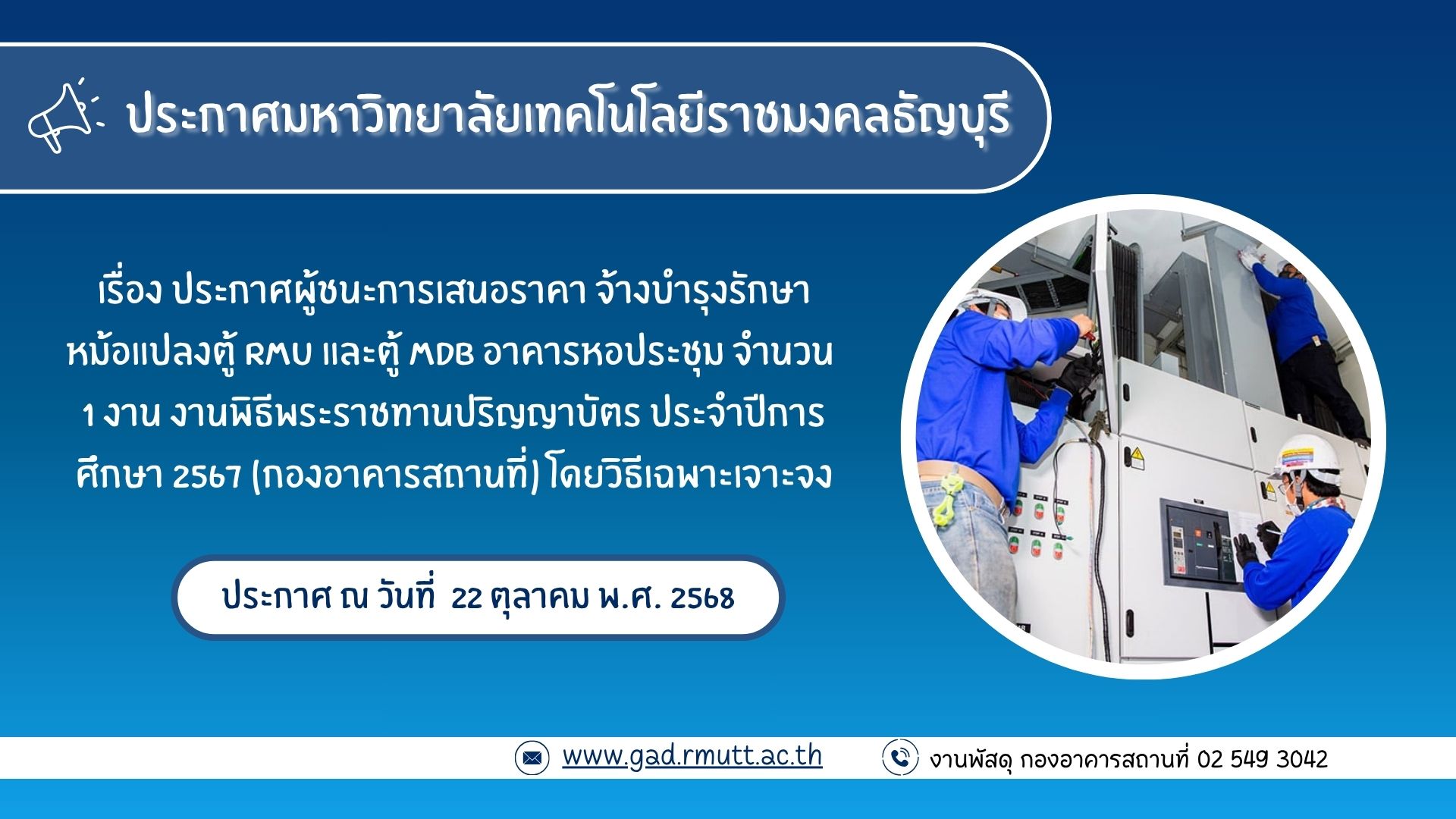 ตุลาคม 22, 2025Published by jaruwan pinkaew at ตุลาคม 22, 2025ประกาศผู้ชนะการเสนอราคา จ้างบำรุงรักษาหม้อแปลงตู้ RMU และตู้ MDB อาคารหอประชุม จำนวน 1 งาน งานพิธีพระราชทานปริญญาบัตร ประจำปีการศึกษา 2567 (กองอาคารสถานที่) โดยวิธีเฉพาะเจาะจงประกาศมหาวิทยาลัยเทคโนโลยี… อ่านเพิ่มเติม ประกาศผู้ชนะการเสนอราคา จ้างบำรุงรักษาหม้อแปลงตู้ RMU และตู้ MDB อาคารหอประชุม จำนวน 1 งาน งานพิธีพระราชทานปริญญาบัตร ประจำปีการศึกษา 2567 (กองอาคารสถานที่) โดยวิธีเฉพาะเจาะจง