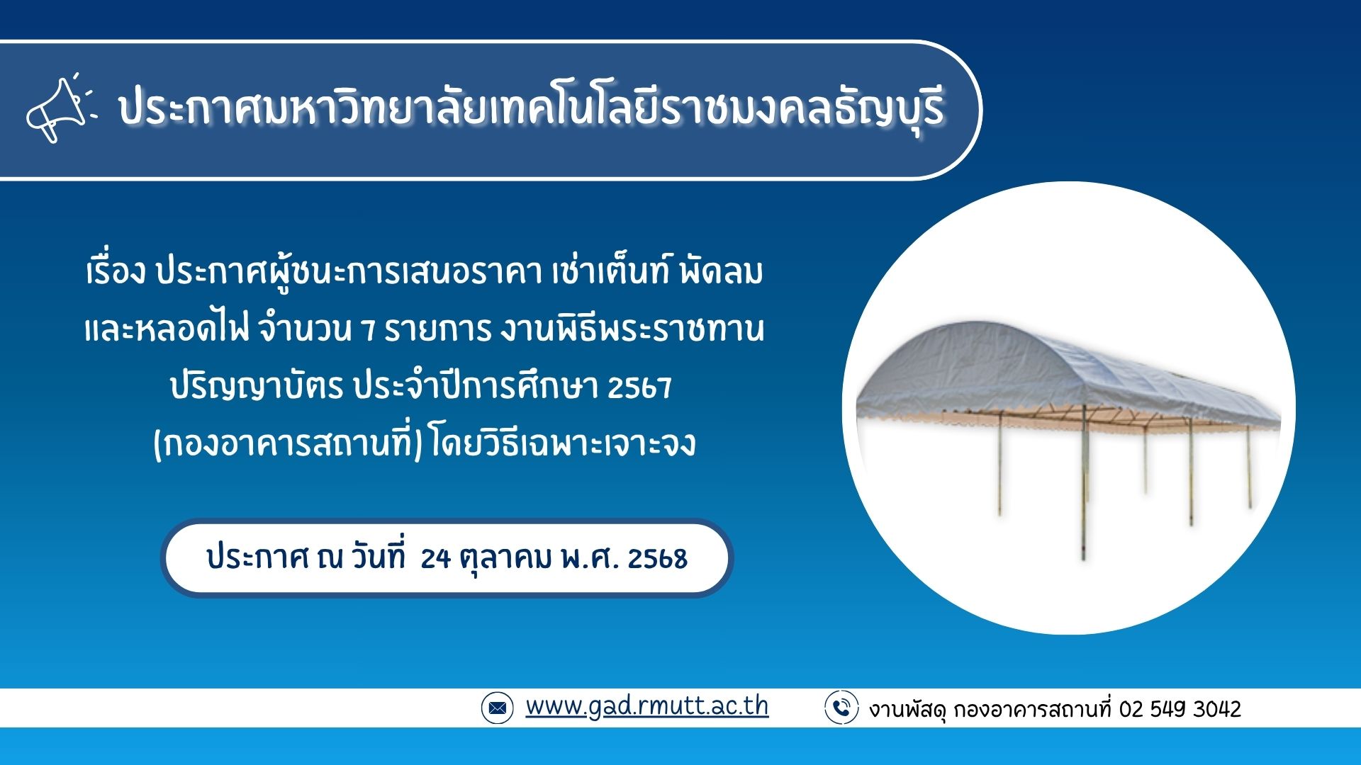ตุลาคม 24, 2025Published by jaruwan pinkaew at ตุลาคม 24, 2025ประกาศผู้ชนะการเสนอราคา เช่าเต็นท์ พัดลม และหลอดไฟ จำนวน 7 รายการ งานพิธีพระราชทานปริญญาบัตร ประจำปีการศึกษา 2567 (กองอาคารสถานที่) โดยวิธีเฉพาะเจาะจงประกาศมหาวิทยาลัยเทคโนโลยี… อ่านเพิ่มเติม ประกาศผู้ชนะการเสนอราคา เช่าเต็นท์ พัดลม และหลอดไฟ จำนวน 7 รายการ งานพิธีพระราชทานปริญญาบัตร ประจำปีการศึกษา 2567 (กองอาคารสถานที่) โดยวิธีเฉพาะเจาะจง